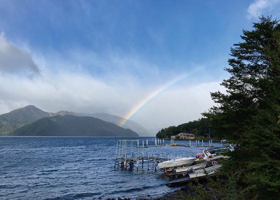 中禅寺郵便局の目の前に広がる中禅寺湖の景色。日本で一番標高の高い場所にある湖です。特に紅葉の時期になると、半月山の山頂にある展望台からは中禅寺湖と男体山(なんたいさん)を一望でき、うっとりするほと美しい眺めに!