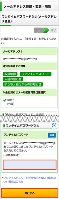 ※ゆうちょ認証アプリを利用されていないお客さまは、変更前のメールアドレス、変更後のメールアドレスにお送りしたワンタイムパスワードをそれぞれ入力し、「実行する」を押してください。