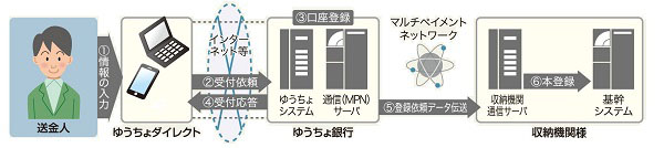 ゆうちょダイレクトを利用して、自動払込みの申し込みができ、収納機関様に電子的に通知する方式です。送金人がゆうちょダイレクトに各種送金人情報の入力を行い、自動払込みの登録を行う「基本方式」のほか、送金人が収納機関様のホームページに各種送金人情報の入力を行う「情報リンク方式」、収納通知サービス照会処理により取得した送金人情報を用いて自動払込みの受付処理を行う「収納サービス連動方式」があります。