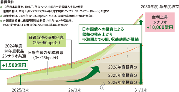 なお、当行は10年などの長期国債への投資を中心に行っており、金利変動型の中期の貸出を行う金融機関と比べ、利益の拡大は時間の経過とともに、後年度に累積的に効果が現れます。