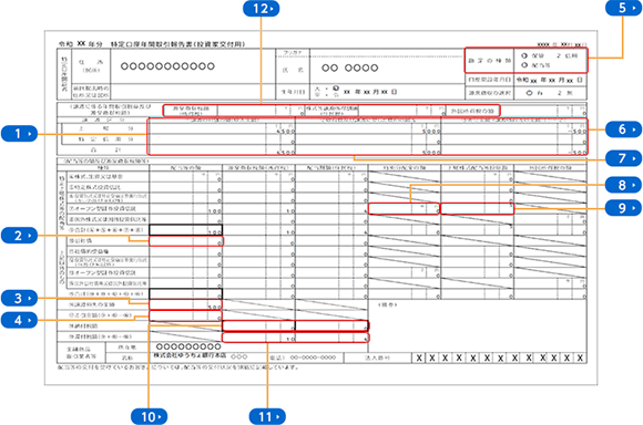 | 税区分 | 解約または買取の場合のみ「申告分離」と印字し、それ以外は「****」と印字します。 | |