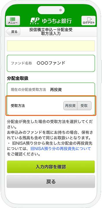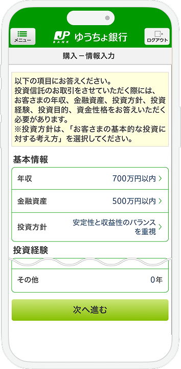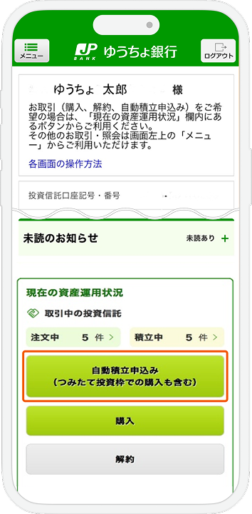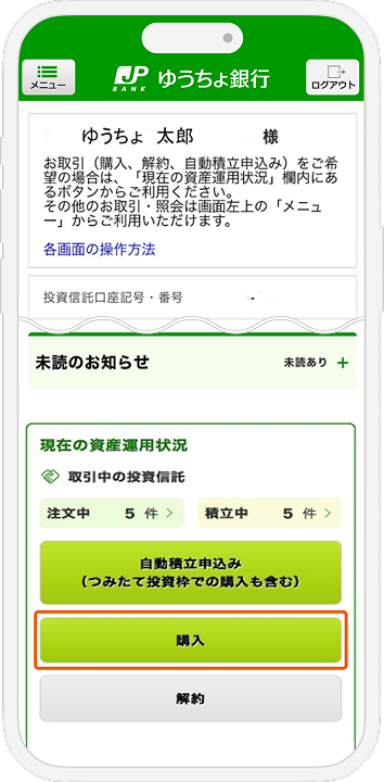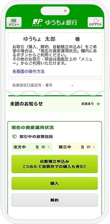 「ゆうちょ通帳アプリ」または「ゆうちょダイレクト」にログインし、メニュー>「投資信託」を選択