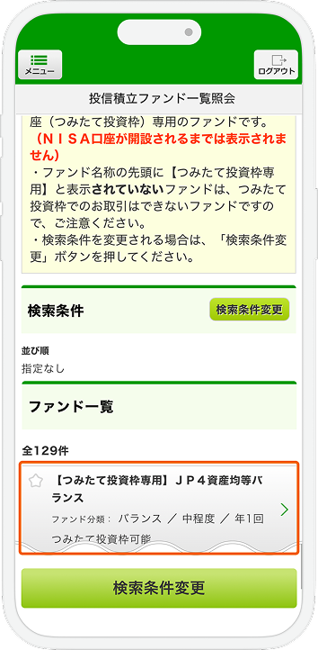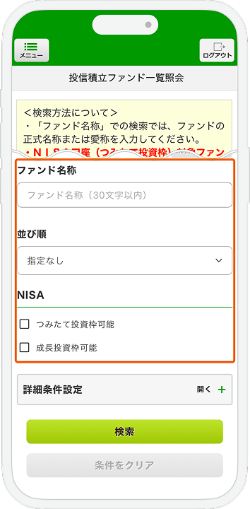 ファンド名称等を入力・選択して検索。購入したい投資信託(ファンド)を選択