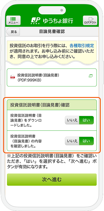各種取引規定、投資信託説明書(目論見書)を確認し、「次へ進む」をタップ