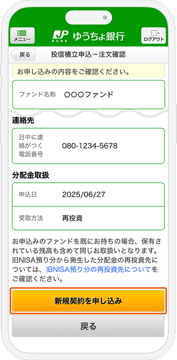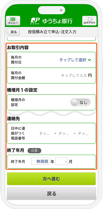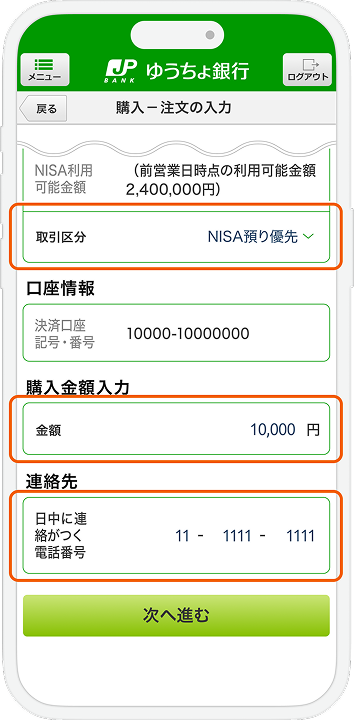 取引区分(課税・NISA)、購入金額、連絡先等を入力し、「次へ進む」をタップ