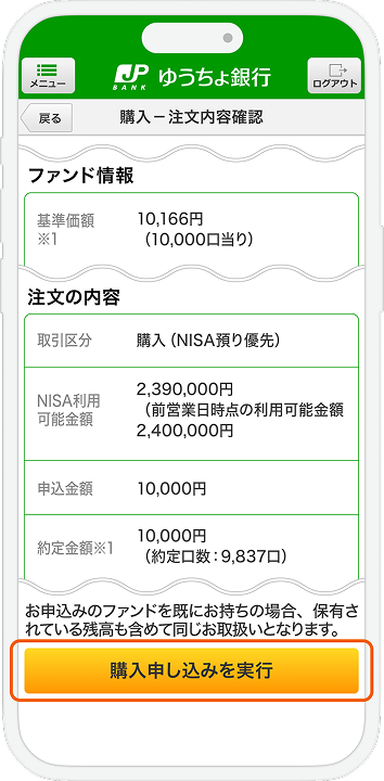 注文の内容を確認し、「購入申し込みを実行」をタップ