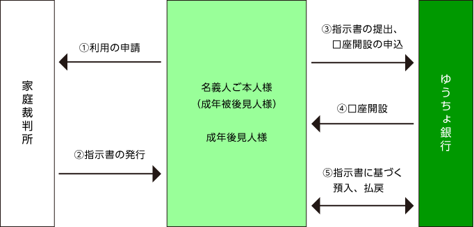家庭裁判所が発行した後見制度支援預貯金契約締結の指示書を交付された成年後見人又は未成年後見人 ※「保佐」「補助」「任意後見」制度をご利用のお客さまは対象外です。 |